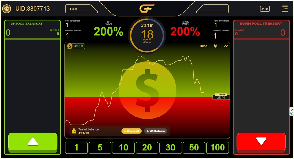Gold Fun Corporation Limited has long been recognized as a traditional enterprise specializing in precious metals trading. Today, driven by innovation, we are boldly venturing into new territories. Our "GF GameFi" game marks a significant milestone in our expansion into the innovative sector, combining the gold market with financial gaming to deliver an unprecedented experience. The game simulates the mechanics of Binary Options, allowing players to predict whether the gold spot price will "go up" or "go down." When each game round ends, the system determines the winner by comparing the final price with the price at the time of the prediction.